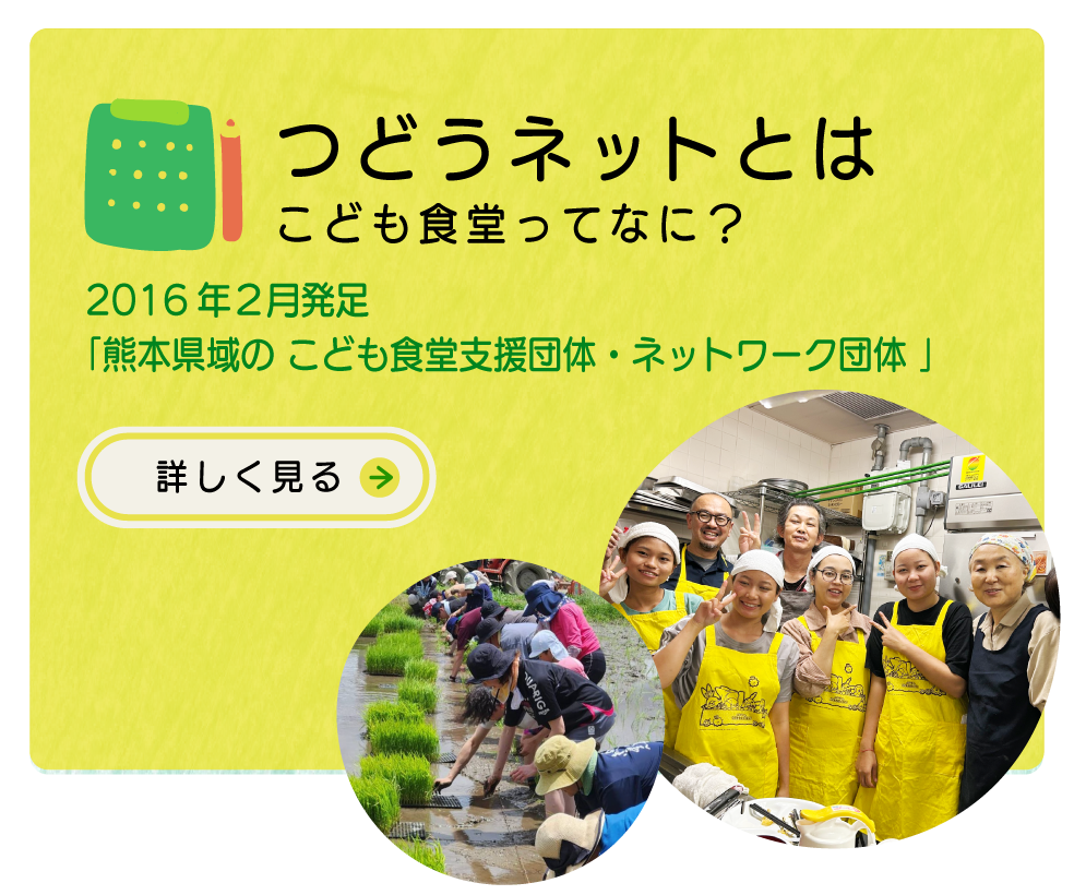 こんにちは、TSUDOU・NETです。私たちは、「こども食堂」や「地域食堂」として、子どもたちや地域住民の方々が安心して、集える「居場所つくり」を熊本県内で目指す方々を支援・応援するために、2016年2月に設立された団体です。地域には、様々な背景やニーズを抱えた子どもやご家庭、また地域住民の方々がいます。私たちは、「食」を通じた温かいつながり・つどう場を提供するため、地域のこども食堂や多世代交流の場を創りたいといった方々を応援しお手伝いする「立ち上げ支援」、また開設以降は食堂の運営者同士が連携して、その運営に寄り添って安定した運営を行なうための「伴走支援」を行なっています。